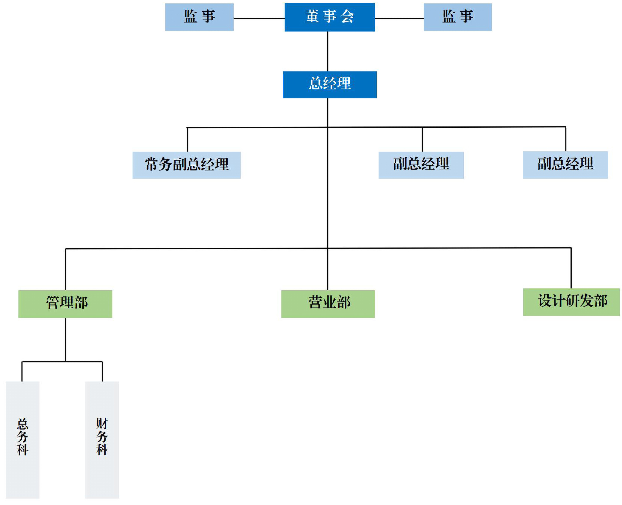 公司下設:管理部、財務部、營業部、海外營業部、品質部、采購部、工程部、設計部共8個部門。