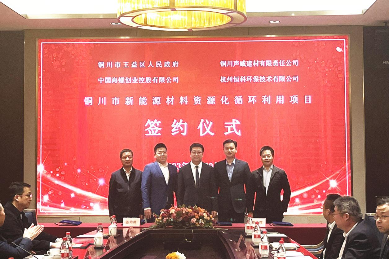 銅川市王益區常務副區長焦耀奇,海螺創業常務副總經理、海創循環董事長疏茂,陜西聲威集團總經理趙挺,杭州恒科環保公司董事長吳濤分別作為代表進行簽約。