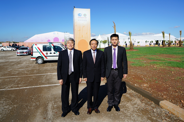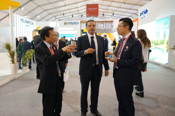 ??? 11月8日上午,在摩中商會、摩洛哥外貿銀行、香港匯盛資本等機構負責人的陪同下,紀勤應總經理一行參觀了聯合氣候大會主展館。展會現場來自世界各地節能環保產業技術展示、部分獨具匠心的展臺設計展現出的世界各國實現綠色循環低碳發展,推進清潔能源、可再生資源,應對氣候變化、追求美好未來的決心等給考察團一行留下了深刻的印象。