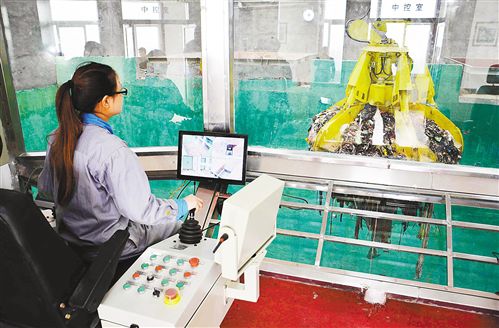 工作人員正在操控機械手抓取垃圾