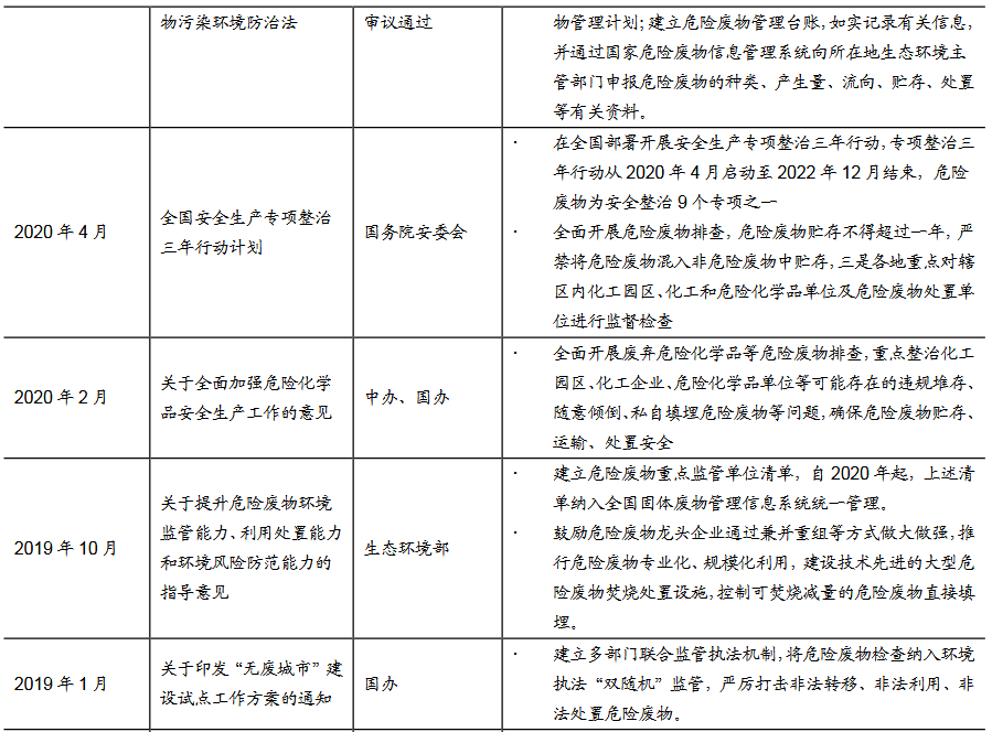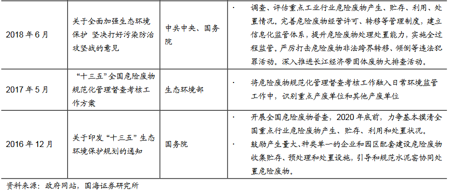 “十三五”以來,從中央到各部委,已出臺多項關于危廢排查與清單管理、危廢處理處置設施管理、問責機制等體系化政策,此外,環保督察不斷推進,逐步由中央下沉至地方,政策層面對危廢量的提升作用明顯。