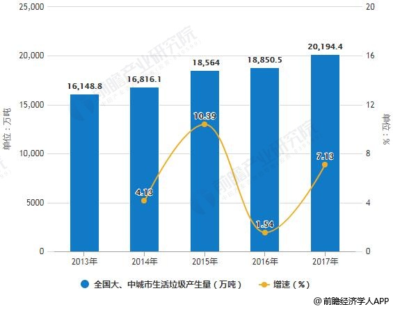 2013-2017年全國大、中城市生活垃圾產(chǎn)生量統(tǒng)計(jì)及增長情況