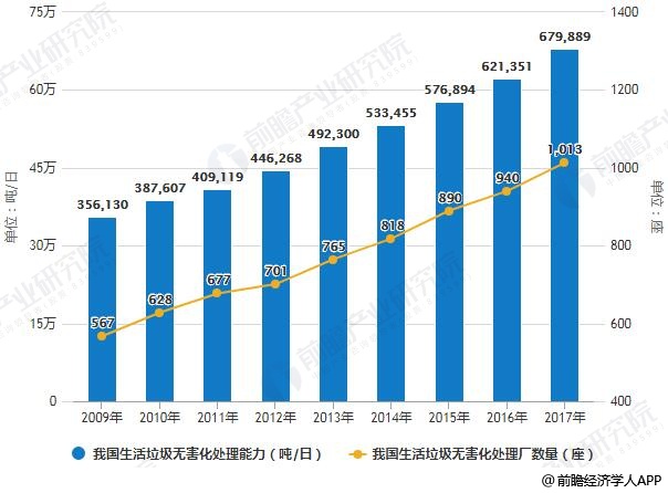 2009-2017年我國生活垃圾無害化處理能力及無害化處理廠數(shù)量統(tǒng)計(jì)情況
