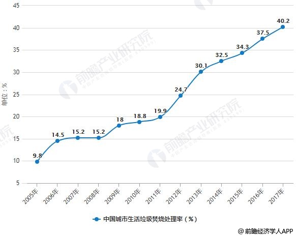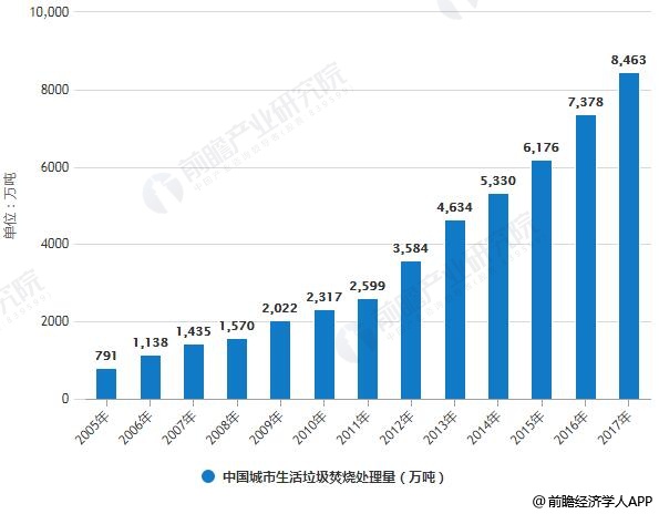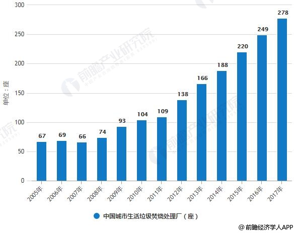? ? 和傳統(tǒng)的堆肥、填埋等處理方式相比,焚燒具有處理效率高、占地面積小、對環(huán)境影響相對較小等優(yōu)點(diǎn),更能滿足城市生活垃圾處理對減量化和無害化的要求。并且焚燒處理的方式還能利用焚燒產(chǎn)生的熱能,實(shí)現(xiàn)垃圾的資源化,這些優(yōu)勢使得垃圾焚燒處理在近些年逐漸得到了較為廣泛的應(yīng)用與推廣。焚燒垃圾場的數(shù)量從2005年的67座增長到2017年的286座,焚燒垃圾處理量由2005年的791萬噸增長到2017年的8463.3萬噸。焚燒處理率由2005年的9.8%上升到2017年的40.2%。
