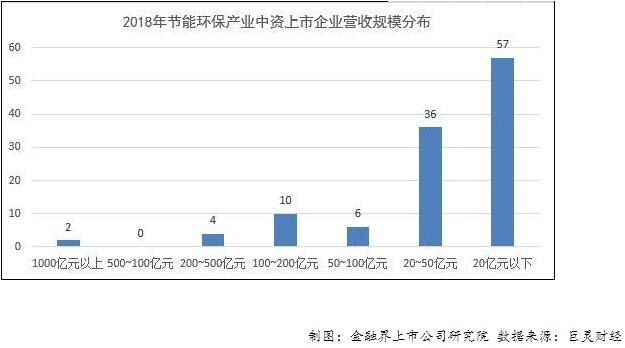 ? ? 在對截至4月30日已披露2018年營收數(shù)據(jù)的節(jié)能環(huán)保產(chǎn)業(yè)中資上市企業(yè)不同營收規(guī)模的企業(yè)數(shù)量情況進行分析的過程中,報告發(fā)現(xiàn),在節(jié)能環(huán)保產(chǎn)業(yè)中資上市企業(yè)中,營收規(guī)模在1000億元以上的有2家,營收規(guī)模在500億元~1000億元之間的企業(yè)數(shù)量為0,多數(shù)企業(yè)營收規(guī)模都在50億元以下。說明我國節(jié)能環(huán)保產(chǎn)業(yè)企業(yè)業(yè)務規(guī)模普遍較小,行業(yè)集中度不高。