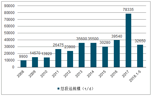 2008-2018.1-5垃圾焚燒行業(yè)總投運規(guī)模
