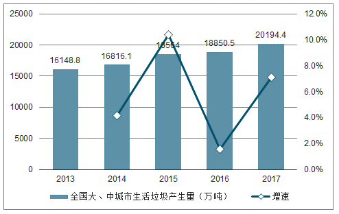 2013-2017年全國大、中城市生活垃圾產(chǎn)生量統(tǒng)計及增速