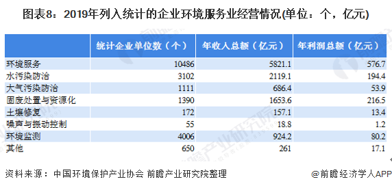 據環境保護產業協會數據,2019年我國列入統計的環境服務企業共10486個,年收入總額為5281.1億元,年利潤總額為576.7億元。