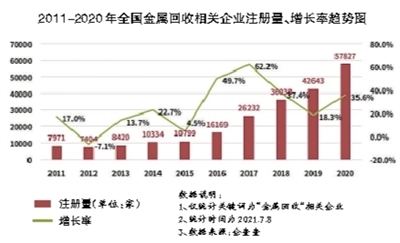 數(shù)據(jù)顯示,目前我國現(xiàn)存“金屬回收”相關(guān)企業(yè)共32.2萬家。2020年是企業(yè)注冊量的高峰期,新增5.7萬家;今年前六月新增4.6萬家,同比增長118%。