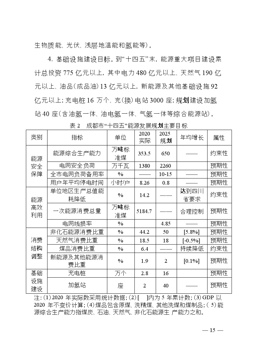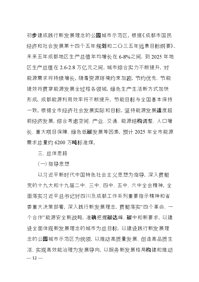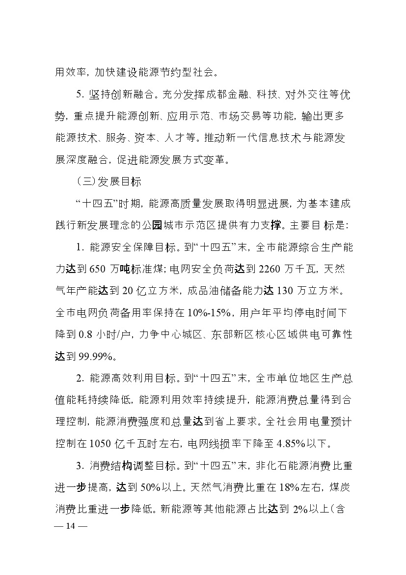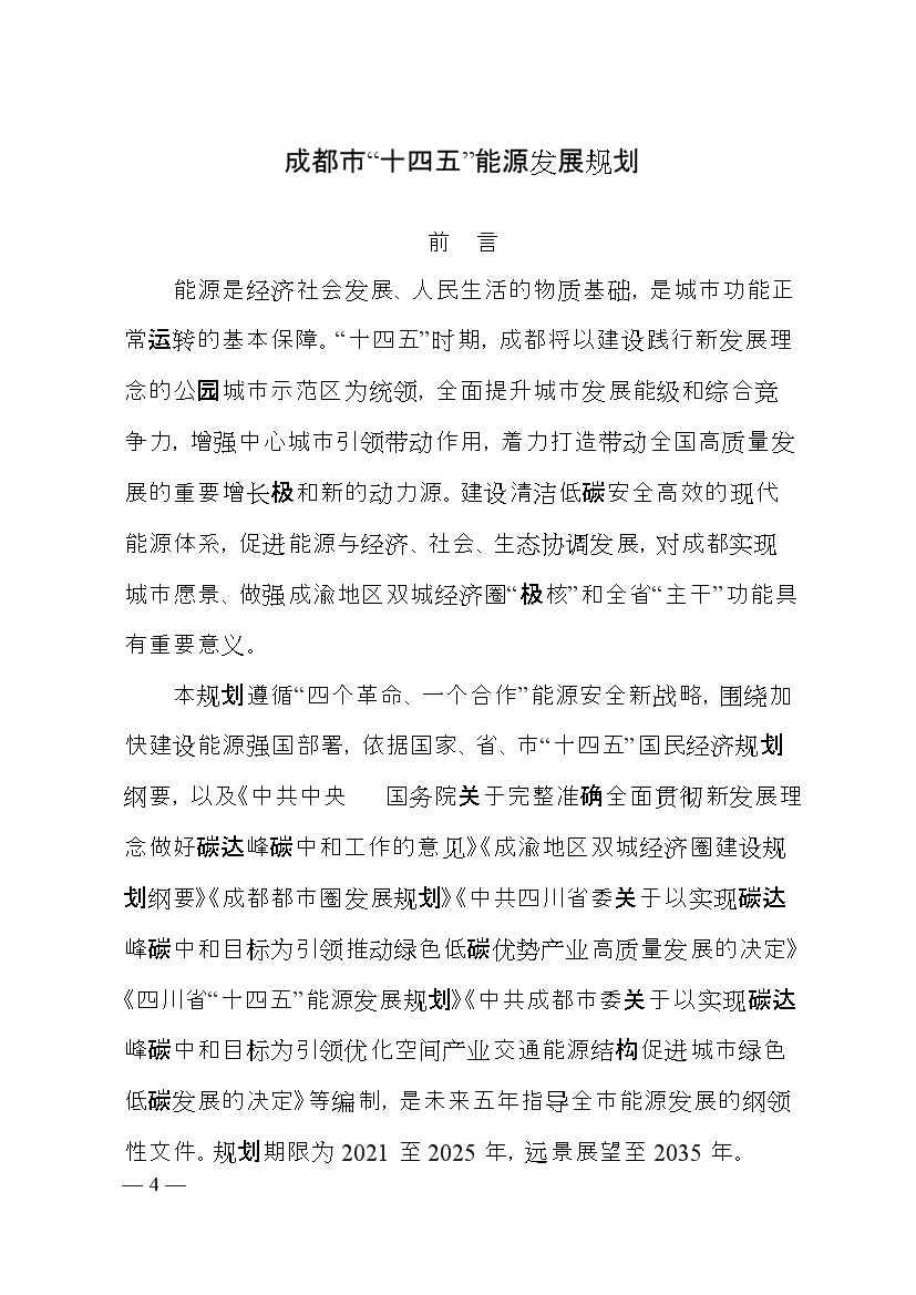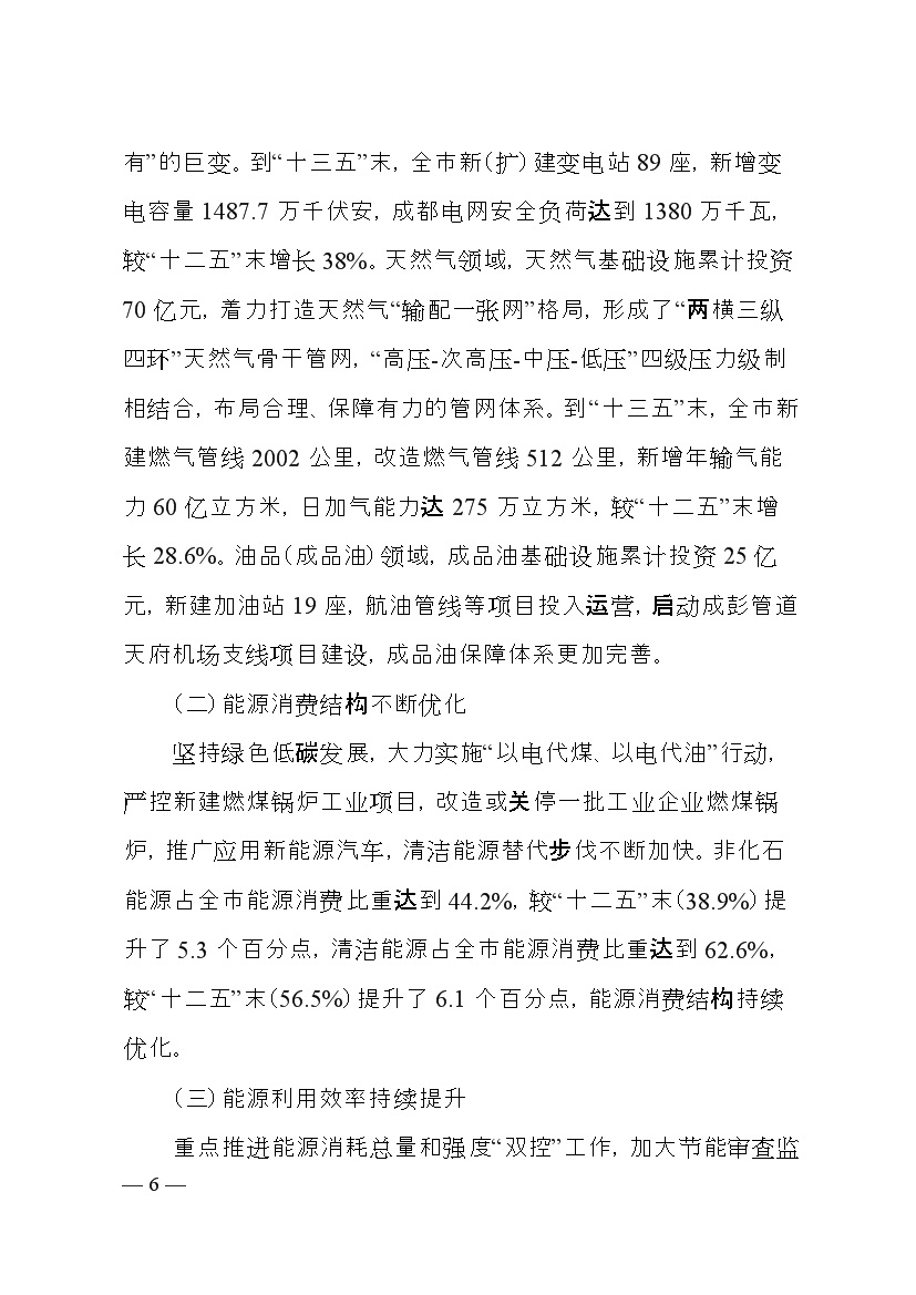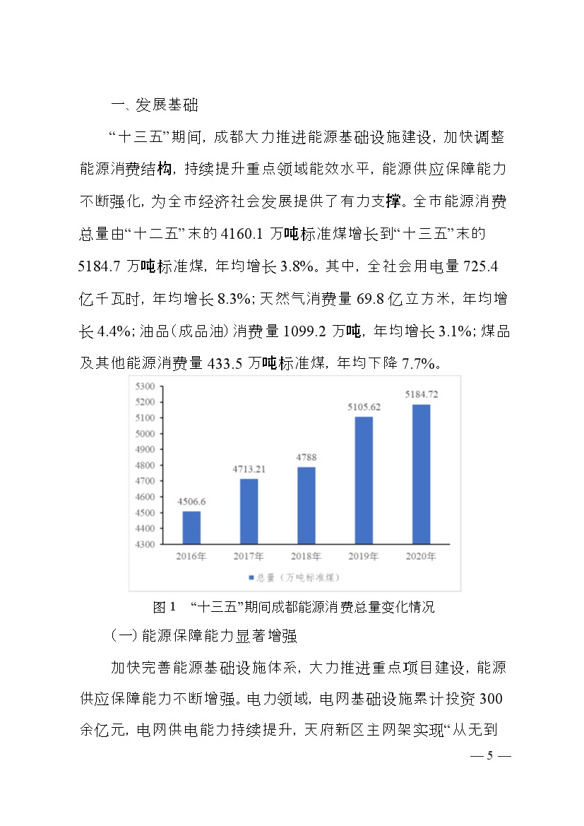 成都市人民政府印發(fā)《成都市“十四五”能源發(fā)展規(guī)劃》,明確了以創(chuàng)新發(fā)展為動力,以強(qiáng)化保障能力為抓手,加快構(gòu)建新型電力系統(tǒng),持續(xù)推進(jìn)清潔能源替代,優(yōu)化能源消費(fèi)結(jié)構(gòu),全力提升能源利用效率發(fā)展思路。并提出總量控制目標(biāo)、消費(fèi)結(jié)構(gòu)目標(biāo)、能源安全保障、等能源節(jié)約目標(biāo)、基礎(chǔ)設(shè)施建設(shè)等發(fā)展目標(biāo)。