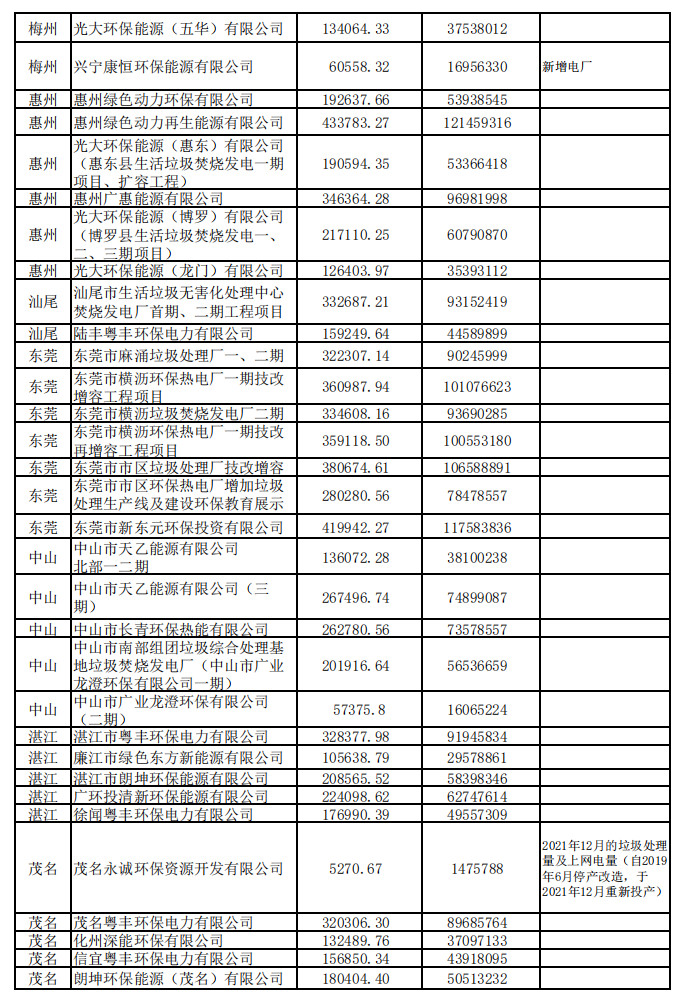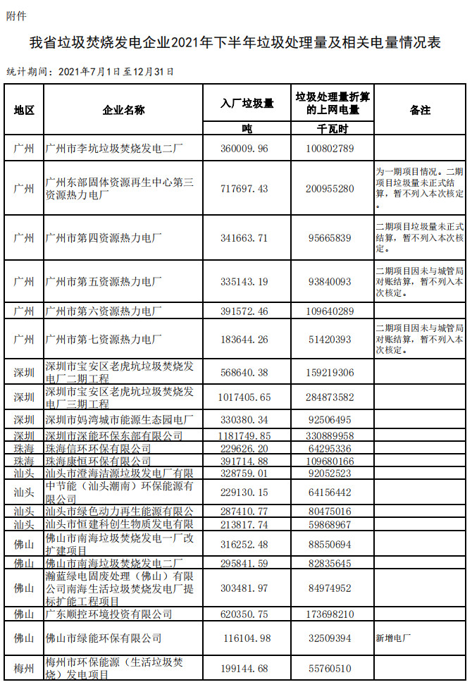 廣東省發展改革委關于公布有關垃圾焚燒發電企業2021年下半年垃圾處理量及相關電量的通知