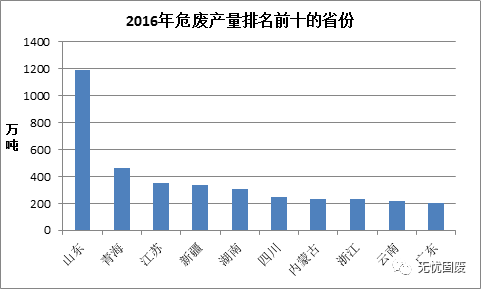 ? ? 其中山東危廢產(chǎn)生量最多,高達1188.28萬噸,其次是青海,產(chǎn)生量為462.05萬噸,江蘇危廢產(chǎn)生量為350.98萬噸,排名第三。