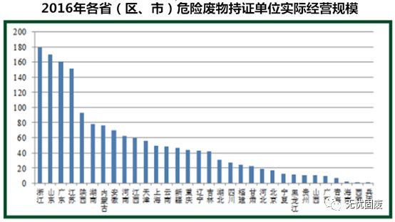 ? ? 截至2016年,全國危險廢物經(jīng)營持證單位共2195家,核準經(jīng)營規(guī)模達到6471萬噸,平均每家約2.9萬噸。但實際經(jīng)營規(guī)模為1629萬噸,平均每家不足0.75萬噸。實際經(jīng)營規(guī)模排在前三位的分別是浙江、山東和廣東。