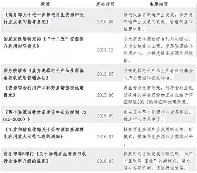 ? ? 社會經濟的高速發展帶來了國民生活水平的不斷提高,同時也伴隨著廢舊物資產生量的大幅上升,為我國再生資源產業的發展提供了良好的發展機遇。由于產業空間巨大,對社會經濟以及環境保護的推動效應明顯,近年來國家陸續出臺多項政策扶持產業發展。