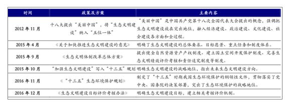 ? ? 隨著政府大力推行生態(tài)文明建設(shè),生態(tài)文明頂層設(shè)計(jì)逐步完善,生態(tài)環(huán)保法制建設(shè)不斷健全。2015年4月,中共中央、國(guó)務(wù)院印發(fā)《關(guān)于加快推進(jìn)生態(tài)文明建設(shè)的意見》,明確了生態(tài)文明建設(shè)的總體要求、目標(biāo)愿景、重點(diǎn)任務(wù)和制度體系。2015年9月,《生態(tài)文明體制改革總體方案》出臺(tái),提出健全自然資源資產(chǎn)產(chǎn)權(quán)制度、建立國(guó)土空間開發(fā)保護(hù)制度、完善生態(tài)文明績(jī)效評(píng)價(jià)考核和責(zé)任追究制度等制度。近兩年連續(xù)出臺(tái)的《新環(huán)境保護(hù)法》、《大氣污染防治行動(dòng)計(jì)劃》、《水污染防治行動(dòng)計(jì)劃》和《土壤污染防治行動(dòng)計(jì)劃》將生態(tài)文明建設(shè)不斷由概念向具體操作領(lǐng)域深入落實(shí)。