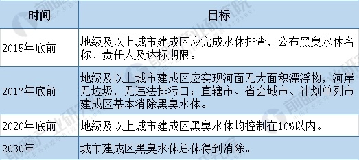? ? 而《水污染防治行動計劃》明確提出,黑臭水體治理目標要求:到2020年,地級及以上城市建成區黑臭水體均控制在10%以內;到2030年,城市建成區黑臭水體總體得到消除。