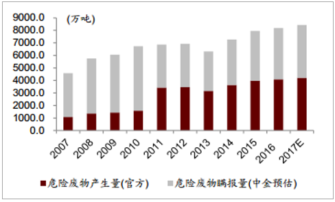 ? ? 危廢生產(chǎn)量逐年上升,從 2011 年的 3,431.2 萬(wàn)噸上升到 2015 年的 3,976.1 萬(wàn)噸,復(fù)合增長(zhǎng)率約為 3%。但是需要注意的是《統(tǒng)計(jì)公報(bào)》采用的是企業(yè)申報(bào)的方法,因此我們認(rèn)為這個(gè)數(shù)據(jù)遠(yuǎn)遠(yuǎn)低于真實(shí)情況。最直接的對(duì)比就是《第一次全國(guó)污染源普查公告》中統(tǒng)計(jì)的 2007 年工業(yè)危廢產(chǎn)生量為4,573.69 萬(wàn)噸,遠(yuǎn)遠(yuǎn)高于當(dāng)年環(huán)保部公布的 1,079 萬(wàn)噸。 2011 年,環(huán)保部大幅修改統(tǒng)計(jì)口徑,擴(kuò)大申報(bào)范圍,當(dāng)年《統(tǒng)計(jì)公報(bào)》披露危廢產(chǎn)生量 3,431 萬(wàn)噸相比 2010 年 1,586萬(wàn)噸上升一倍有余。即使在這樣的情況下,該數(shù)據(jù)依舊遠(yuǎn)遠(yuǎn)小于《普查公告》數(shù)據(jù)。我們根據(jù)工業(yè)增加值的增長(zhǎng)來估計(jì)實(shí)際危廢產(chǎn)生量, 2007 年工業(yè)增加值約為 11.16 萬(wàn)億。2016 年工業(yè)增加值上升到 24.79 萬(wàn)億,復(fù)合增長(zhǎng)率約為 9.26%。如果考慮到企業(yè)減排和循環(huán)利用的因素,我們適當(dāng)調(diào)低危廢產(chǎn)生增速, 2016 年我們預(yù)期的危廢實(shí)際產(chǎn)生量也達(dá)到了 8100 萬(wàn)噸。行業(yè)內(nèi)普遍預(yù)期實(shí)際產(chǎn)生量應(yīng)該在 1 億噸/年。
