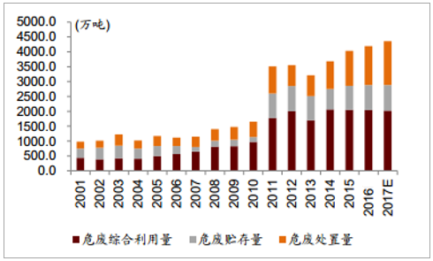 ? ? 我們?nèi)绻凑漳壳耙延械氖袌?chǎng)存量來計(jì)算, 然后按照綜合處臵費(fèi)用 1500 元/噸,無害化處臵 3500 元/噸, 貯存填埋 300 元/噸,以及綜合利用單位附加值 2000 元/噸來進(jìn)行總的粗略計(jì)算,則 2017 年我國(guó)現(xiàn)有危廢存量空間將達(dá)到 1250 億元以上。 需要注意的是,我們沒有考慮到瞞報(bào)漏報(bào)的數(shù)量,如果考慮進(jìn)約 4000 萬(wàn)噸每年的官方未統(tǒng)計(jì)數(shù)量, 實(shí)際需求空間將超過 2000 億元。